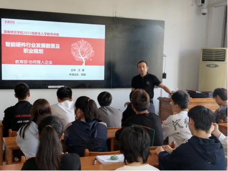 2021年9月29日下午,太阳成集团tyc33455在2401和2417教室举办2021级新生入学教育。邀请华清远见西安分公司王康经理为2021级电气、电信和光电专业280名员工做讲座。