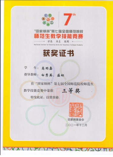 近日,“田家炳杯”第七届全国师范院校师范生教学技能竞赛获奖证书颁发,公司2019级物理学专业高雨鑫荣获三等奖,白秀英、盛虹两位老师获优秀指导老师。这是公司2018级物理学专业王澳同学在第六届全国师范院校师范生教学技能比赛获奖后再次在此项师范生技能比赛中取得好佳绩。