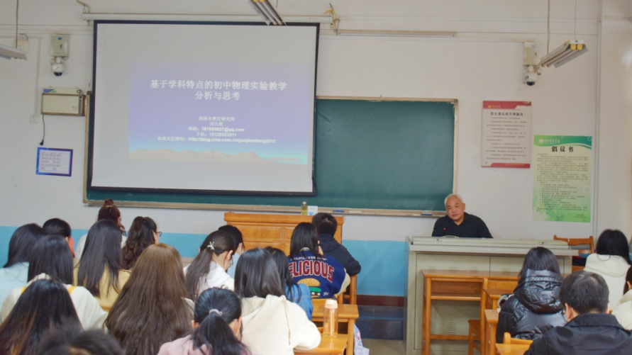 陕西省教学名师、特级教师郭九胜结合自己学习、工作、教研经历,分享了他对物理学科特点、中考要求及物理实验教学的思考,报告过程中他围绕着物理学科内涵、物理教师的学识素养、中考命题的指导思想、物理实验考点以及如何有效的进行实验教学,对在校的师范生提出了三点要求:一是多读书、勤思考、善于沟通交流;二是要耐得住寂寞,守得住清贫,经得起诱惑,三是要热爱教育,热爱员工,要有教育情怀。