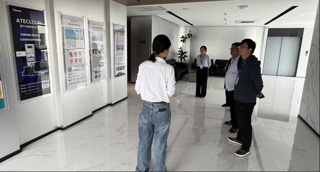 在安泰公司讲解员的带领下,公司一行首先参观了企业展厅,深入了解了安泰测试的发展历程、技术产品及未来战略方向。讲解员详细介绍了公司在电子测试领域的技术积淀和行业影响力,并就公司在智能制造与工业测控等方面的创新成果进行了分享。